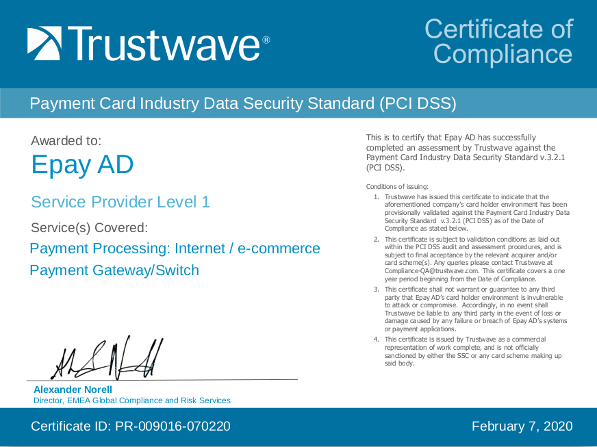 ePay.bg is a certified VISA and MasterCard service provider (Level 1 Service Provid) since 2007.